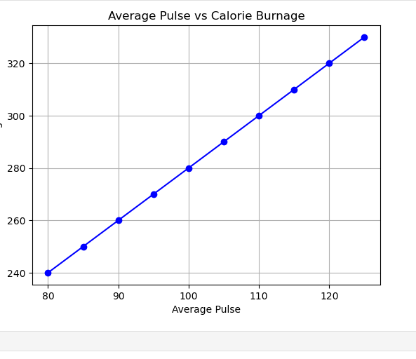 In the above graph, the data points represent the relationship between Average Pulse (x-axis) and Calorie Burnage (y-axis). As Average Pulse increases from 80 to 125, the Calorie Burnage also increases. The pattern suggests that for every 10 increase in Average Pulse, the Calorie Burnage increases by approximately 20 calories.