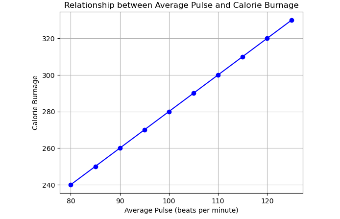 Finally, we can plot the data using the matplotlib library to visualize the relationship between average pulse and calorie burnage: