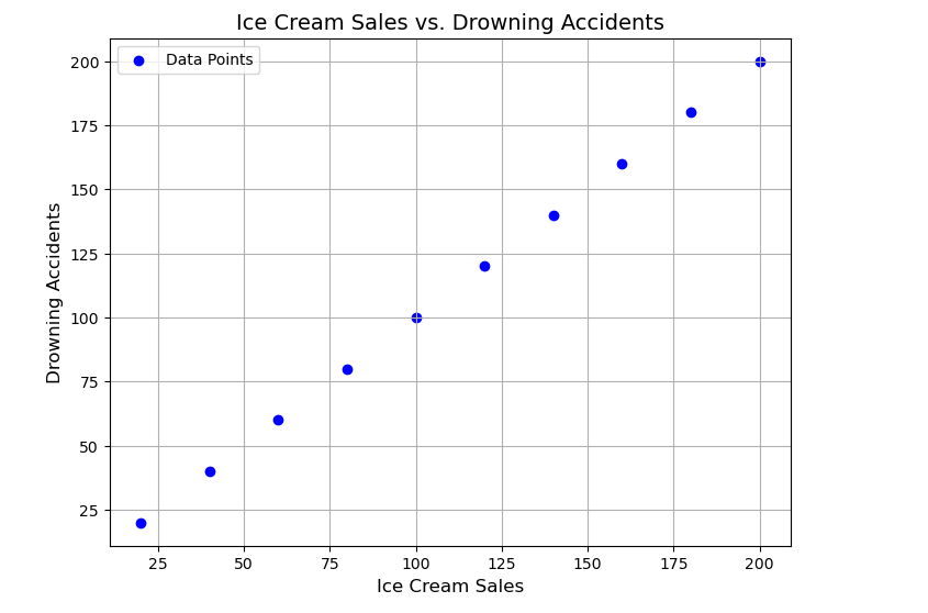The scatter plot shows a perfect positive correlation between ice cream sales and drowning accidents. However, this does not mean that one causes the other. Instead, both are influenced by summer weather.