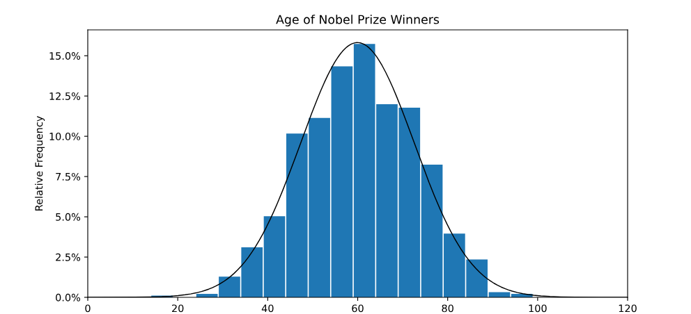 यहाँ Nobel Prize जीतने वाले winners की उम्र का एक histogram दिया गया है, जब उन्होंने prize जीता।”